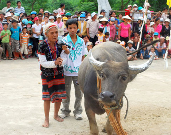 Khi tiến hành nghi thức đâm trâu, người phụ nữ tỏ ra thương xót và vỗ về an ủi con vật hiến sinh. Họ giải thích với con trâu rằng họ không muốn giết nó đâu, nhưng buộc phải làm thế để dâng cho thần linh. Mong con trâu hãy hiểu và thông cảm cho người. Sau khi chết, hồn trâu hãy phù hộ cho dân làng, đừng làm hại hay oán trách gì.