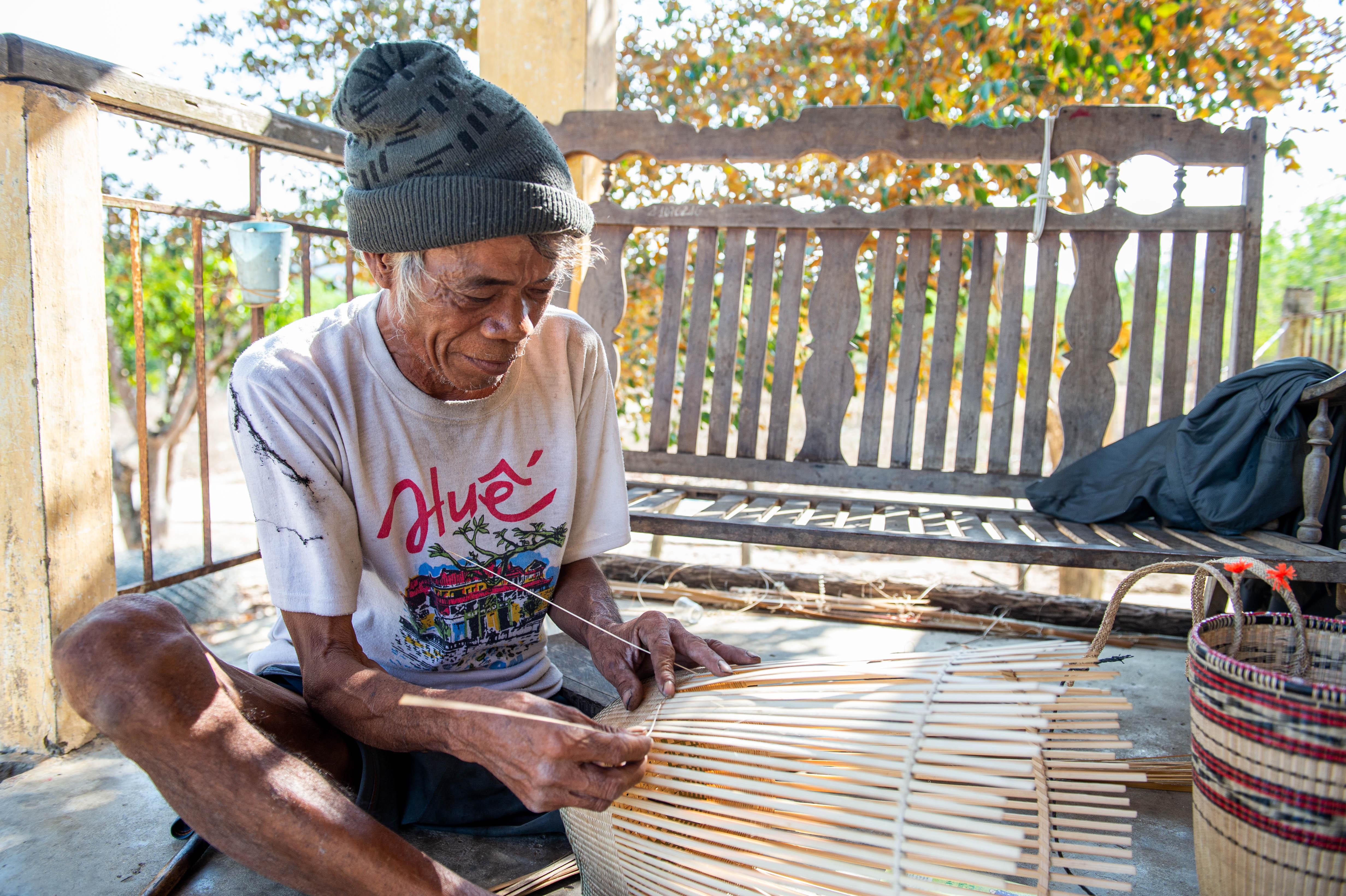Đến nay, ông A Dót đan gùi được hơn 40 năm. Ông chỉ còn 1 chân phải (do tai nạn lao động hồi trẻ), việc đi lại khó khăn nên vật liệu để đan gùi đều do các con của ông đi rừng kiếm được.