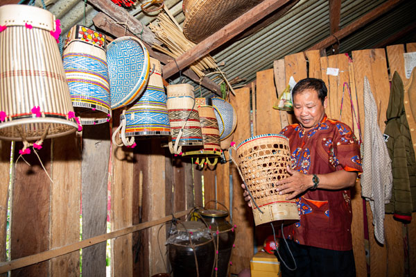 Ông Puih Jới (68 tuổi) được mọi người trong làng Trấp biết đến là người đan gùi lâu năm. Ngoài đan những chiếc gùi truyền thống, ông còn đan những chiếc gùi “cách tân”, đủ kích cỡ và màu sắc. Những chiếc gùi ông đan được rất nhiều người tìm mua để phục vụ việc sinh hoạt, lao động hàng ngày cũng như việc biểu diễn trong các lễ hội.