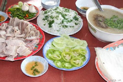 Vào một quán bánh hỏi ở Diêu Trì, khi gọi món này là bạn sẽ được thưởng thức thêm hai món nữa, đó là cháo và lòng. Đây chính là nét đặc biệt của bánh hỏi Diêu Trì. Cháo khá loãng, nấu bằng huyết ninh với thịt nạc băm. Cháo vừa ngọt lại vừa loãng, thơm. Cháo là món đưa "trơn" mà không cần dùng rượu. Cạnh là đĩa lòng heo. Lòng được chế biến rất khéo, có lẽ không nơi nào bằng. Những miếng gan dày, miếng dồi màu nâu, khoanh tròn bên cạnh những miếng tim deo dẻo, miếng cổ dai dai giòn giòn, và cả miếng bầu dục mong mỏng. Những thứ này ăn kèm với bánh hỏi, khiến bánh hỏi trở nên béo bở, ngon ngọt khác thường. Thỉnh thoảng húp một muỗng cháo lòng - Thỏa như "uống rượu mà không say"./.