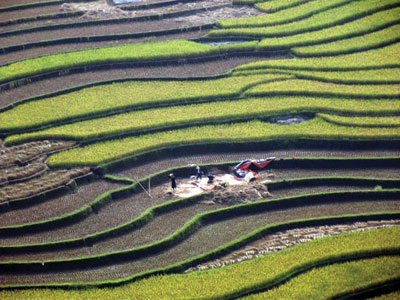 Buổi chiều, chúng tôi xuống dốc theo con đường chính của Tú Lệ, hết đoạn hàng quán, phố xá là thấy ruộng. Ruộng bậc thang đẹp như tranh. Trên cánh đồng, dòng người gánh lúa lên đường, nơi có xe máy chờ sẵn để chở về. Giá lúa nương khá đắt, 20.000đ/kg. Con số ao ước của nhà nông. Một thanh niên cho biết, trong năm có hai mùa lúa vào tháng Năm và tháng Chín, làm lúa nếp cực hơn lúa tẻ nên giá thành cao hơn.