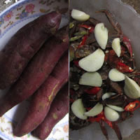 Những có lẽ thú vị nhất là khoai lang nấu ăn với ba khía trộn chua ngọt. Khá giống cua đồng, ba khía có đôi càng màu đỏ nâu, lườn bụng đỏ nhạt, có tám ngoe, càng và ngoe dẹp, phần dưới có lông lấm thấm, vỏ mỏng, mỗi con ba khía thường nặng chỉ năm ba gam. Vì trên mu có ba lằn gạch nên nó được gọi là... ba khía.