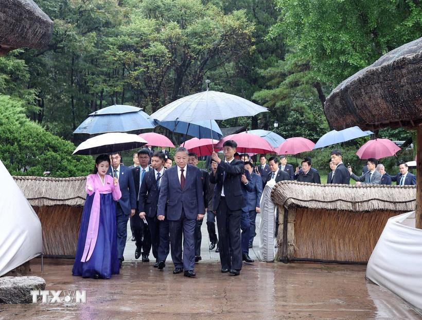 Cũng trong chiều 10/10 theo giờ địa phương, Tổng Bí thư Tô Lâm và Đoàn đại biểu cấp cao Việt Nam thăm Bảo tàng Phát triển Nghệ thuật Âm nhạc Chủ thể, nơi thể hiện một cách tổng hợp và trực quan quá trình lịch sử phát triển của nghệ thuật âm nhạc cách mạng Triều Tiên.