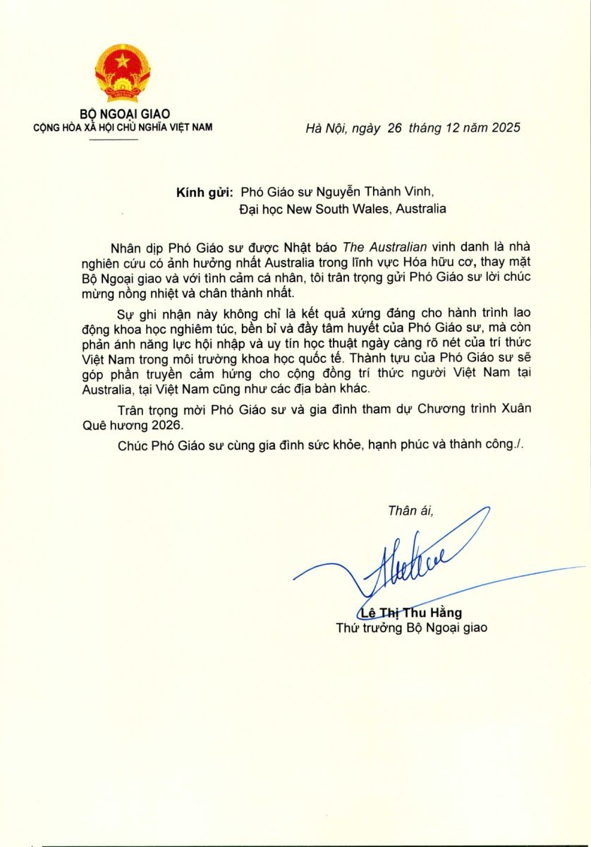 Nhân dịp Phó Giáo sư Nguyễn Thành Vinh, Đại học New South Wales (Australia), được Nhật báo The Australian vinh danh là nhà nghiên cứu có ảnh hưởng nhất Australia trong lĩnh vực Hóa hữu cơ, Thứ trưởng Bộ Ngoại giao Lê Thị Thu Hằng đã gửi Thư chúc mừng, ghi nhận những đóng góp nổi bật của ông đối với khoa học và cộng đồng trí thức Việt Nam ở nước ngoài.