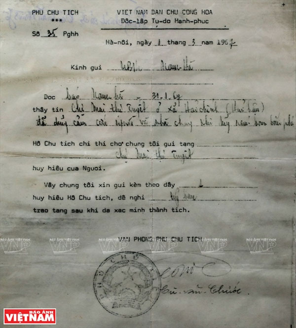 ![]() Thời trẻ, bà Mai Thị Tuyết từng là xã đội trưởng và được Chủ tịch Hồ Chí Minh gửi tặng huy hiệu của Người. Ảnh: Tư liệu