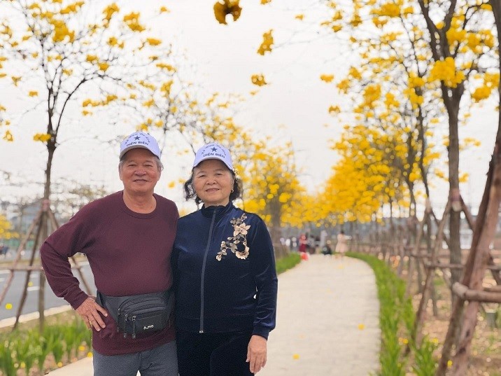 | Chú Hải Lưu (cư dân sống tại Khu đô thị Park City) cùng vợ tranh thủ check-in đường hoa rực rỡ này. |