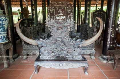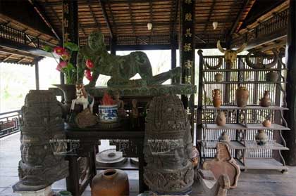 Đặc biệt, bên trong ngôi nhà này trưng bày nhiều cổ vật quý hiếm như bộ ván của vua Bảo Đại, bộ bàn của quan thượng phẩm, chiếc gương soi của hoàng hậu, long sàng của vua…