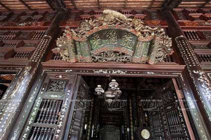 Trên thân đòn có hình ảnh Tứ linh long, lân, quy, phụng và Tứ hữu mai, lan, cúc, trúc. Các tấm vách chạm trổ một số hình hoa quả, chim muông tượng trung cho hạnh phúc.