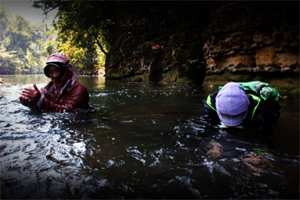 Để đi hết Hung Tụng không dễ, cứ hết bơi qua những con suối lại trèo qua những vách đá hiểm trở. Khung cảnh mỗi lúc thêm lạ lẫm, cảm giác như lạc vào một miền cổ tích và thấy mình trở nên thật nhỏ bé.