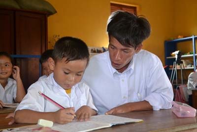 Thầy giáo Cao Văn Giáp tận tâm chỉ dạy từng nét chữ cho học sinh lớp 1 |