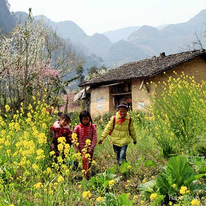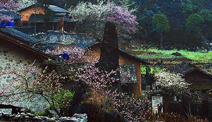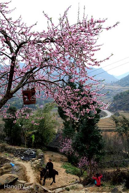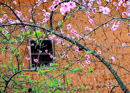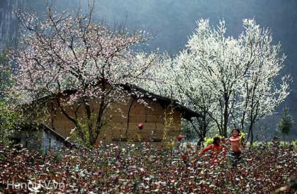 Ven con đường ngoằn ngoèo những khúc cua, xe của chúng tôi đỗ lại bên bờ rào đá đang trổ ra những cánh hoa đào màu hồng ấm. Thân cây cằn lên màu mốc thếch của thời gian, bức tường đá vẫn vẹn nguyên, nặng trịch, lạnh lùng... nhưng chẳng thể ngăn được mầm sống mãnh liệt đang cựa mình bật thức. Nơi địa đầu Tổ quốc, khi cái lạnh cuối cùng mùa Đông hãy còn đang nấn ná trên ngọn cây, giăng mắc trên nếp nhà và làm nứt nẻ đôi môi của cô gái Mông thì đất trời lại ưu ái, hào phóng ban cho nơi này sắc trắng của mận, mơ, hồng nhạt của đào phai… mà sớm dệt nên bức tranh Xuân ấm áp.
