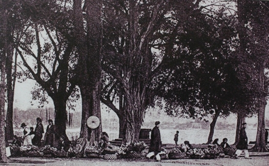 Một góc chợ hoa bên hồ Gươm xưa kia. Hồ Gươm còn có nhiều tên gọi khác như Lục Thủy, Tả Vọng. Hoàn Kiếm cũng là cái tên thân thuộc của hồ vì gắn với truyền thuyết vua Lê trả gươm cho rùa thần sau khi đánh đuổi giặc Minh ra khỏi bờ cõi đất nước.