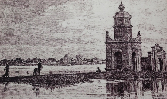 Tháp Hòa Phong vào thế kỷ 19. Tranh khắc dựa trên ảnh tư liệu do bác sĩ Hocquard thực hiện năm 1884. Tháp Hòa Phong cao 3 tầng. Tầng 1 có 4 vòm cửa, gọi là tứ môn tháp, tầng 2 có 4 góc xây trụ vuông đặt tượng 4 con nghê hướng về phía Đông, tầng 3 ghi "Hòa Phong tháp".