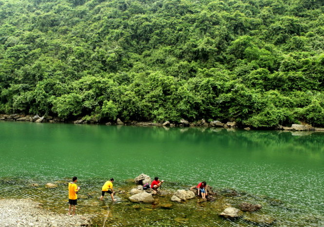 Từ bến Bèo, chiếc thuyền máy đưa chúng tôi lướt đi giữa kỳ quan mây trời sông núi, tìm một bãi biển vắng và thả cả nhóm xuống “tập bơi” cho chán rồi mới trở lại thuyền.