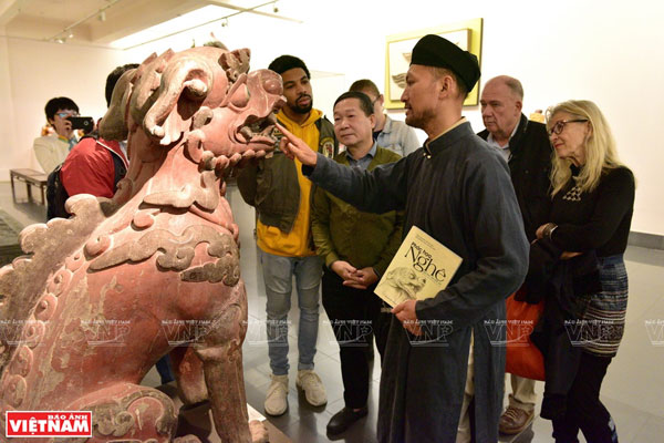 |   Du khách được xem trực tiếp một con Nghê và nghe Tiến sĩ Trần Hậu Yên Thế chia sẻ những câu chuyện lịch sử về Nghê Việt. Ảnh: Trần Thanh Giang |