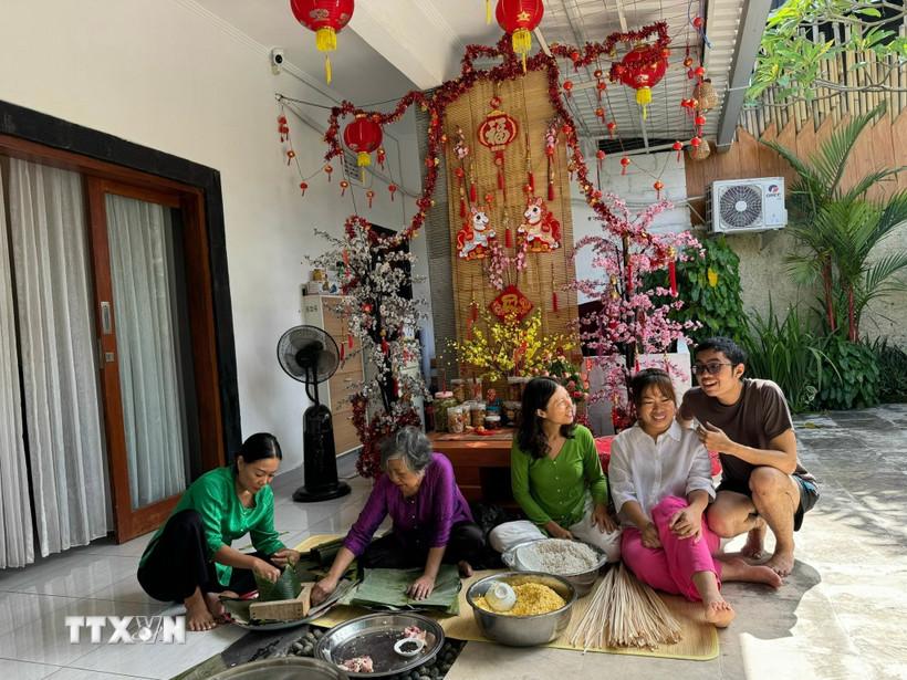 Các đại biểu và khách mời quốc tế cùng nâng ly chúc mừng năm mới và thưởng thức các món ăn đặc trưng ngày Tết như bánh chưng, giò, chả, nem rán, góp phần lan tỏa bản sắc văn hóa Việt Nam tại Indonesia./.