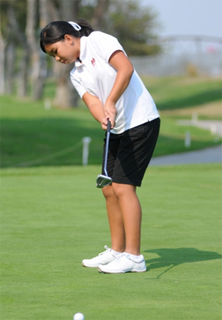 Janneinne Lê trên sân tập golf (Ảnh: Người Việt) |