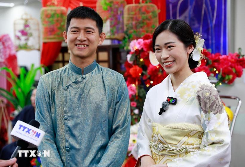 Các cặp đôi Việt-Nhật chụp ảnh lưu niệm chung. Ảnh: Xuân Giao/TTXVN