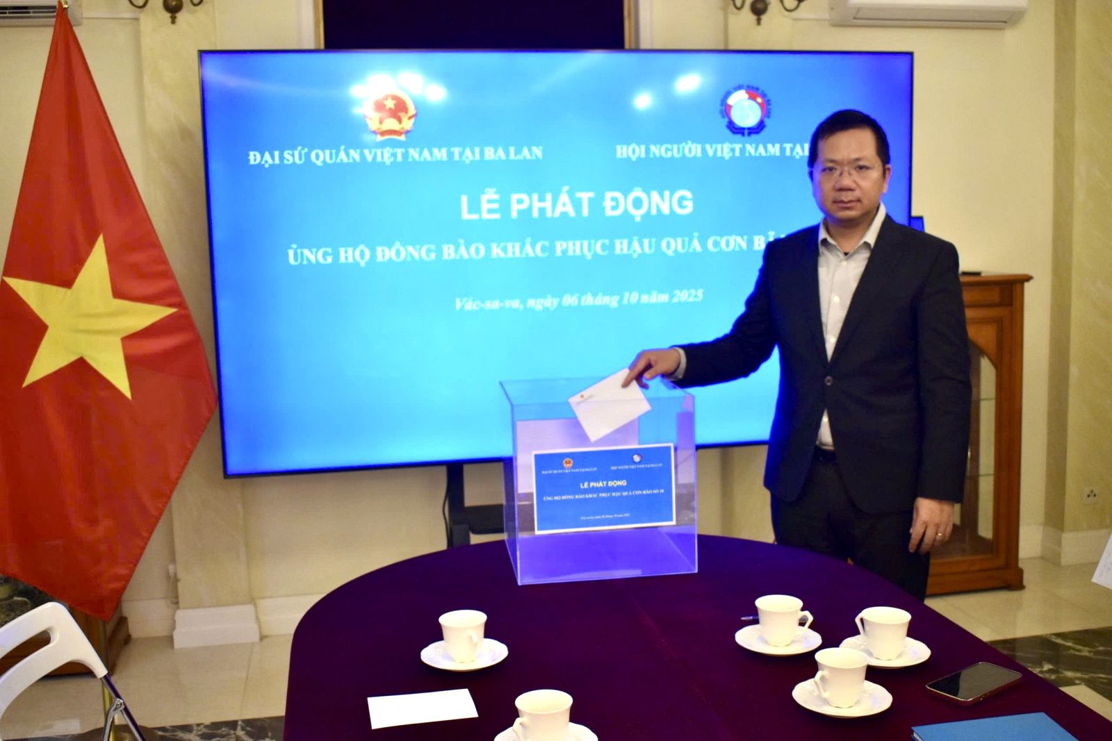 Ngày 06/10/2025, tại trụ sở Đại sứ quán Việt Nam tại Ba Lan, Đại sứ quán phối hợp với Hội Người Việt Nam tại Ba Lan tổ chức Lễ phát động ủng hộ đồng bào khắc phục hậu quả cơn bão số 10. Buổi lễ có sự tham dự của Đại sứ Hà Hoàng Hải, Chủ tịch Hội Người Việt Nam tại Ba Lan Trần Anh Tuấn, cùng đại diện các tổ chức hội đoàn, doanh nghiệp và cá nhân trong cộng đồng người Việt.