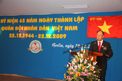 Phát biểu trong không khí ấm tình đồng đội năm xưa, Chủ tịch Mai Ngọc Yên đã ôn lại những chặng đường lịch sử vẻ vang của Quân đội Nhân dân Việt Nam trong cuộc kháng chiến đánh đuổi thực dân và đế quốc xâm lược giành độc lập dân tộc, cũng như trong sự nghiệp xây dựng và bảo vệ tổ quốc. 65 năm qua, Quân đội Nhân dân Việt Nam không ngừng phát triển và lớn mạnh, khó khăn nào cũng vượt qua, kẻ thù nào cũng đánh thắng, hoàn thành xuất sắc nhiệm vụ vinh quang của Đảng và nhân dân giao phó, bảo vệ toàn vẹn lãnh thổ của tổ quốc Việt Nam. Ông Mai Ngọc Yên nhấn mạnh, các cựu quân nhân và thanh niên xung phong năm xưa đã dũng cảm, kiên cường, vì nhân dân quên mình, cống hiến cả tuổi thanh xuân cho sự nghiệp đấu tranh giải phóng dân tộc và ngày nay trong môi trường công tác mới, họ vẫn luôn phát huy truyền thống của anh bộ đội Cụ Hồ, nhất mực gương mẫu trong mọi hoạt động và sinh hoạt của cộng đồng người Việt Nam ở Đức, là tấm gương cho các thế hệ con cháu noi theo, xứng đáng với truyền thống anh hùng của Quân đội nhân dân Việt Nam.