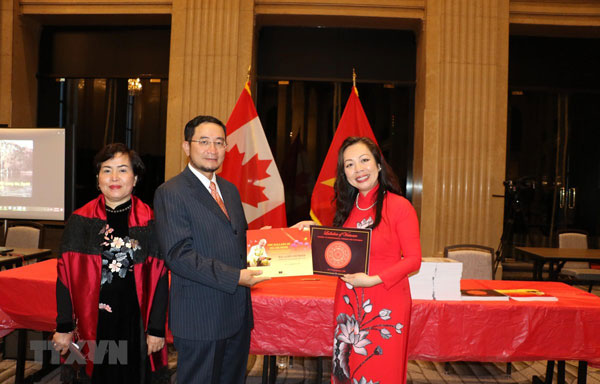 Giáo sư Julie Nguyễn (áo đỏ) tặng Đại sứ Việt Nam tại Canada Phạm Cao Phong và phu nhân hai tác phẩm "Bài ca Hồ Chí Minh" và "Lời ru nước Việt" mà giáo sư vừa ra mắt. (Ảnh: Vũ Quang Thịnh/TTXVN) |