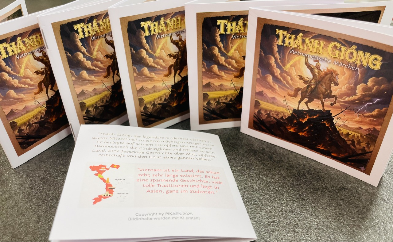 Đại diện Tạp chí Hương Việt, ông Phạm Khánh Nam, đã phối hợp cùng trường Theresia-Gerhardinger ở vùng Bayern tổ chức buổi đọc sách và giao lưu văn hóa đặc biệt dành cho các em học sinh. Không chỉ dừng lại ở bản tiếng Đức, ông Nam còn giới thiệu “Thánh Gióng” bằng tiếng Việt, giúp các em được nghe và trải nghiệm một ngôn ngữ hoàn toàn khác biệt so với tiếng Đức các em sử dụng hằng ngày.