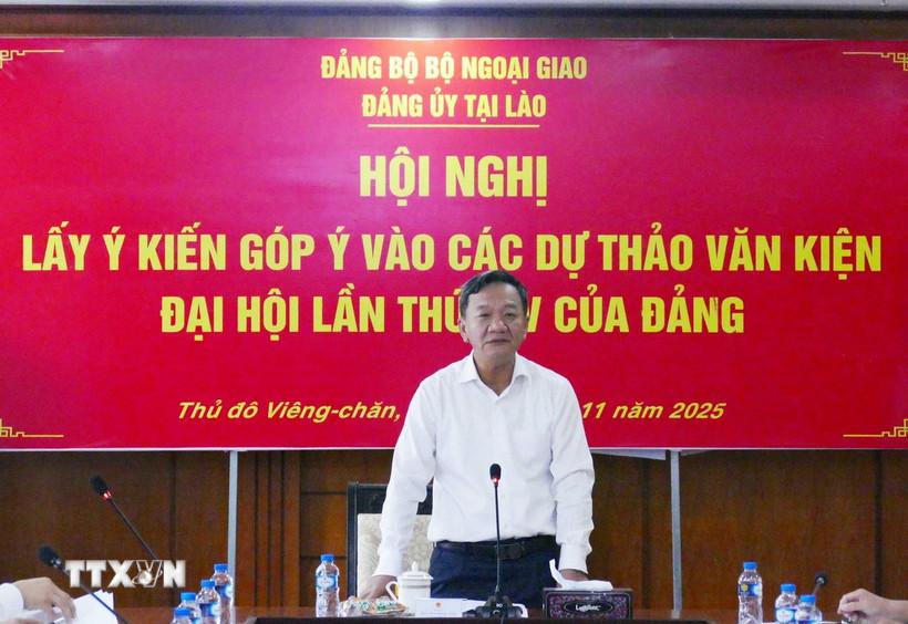 Phát biểu tại hội nghị, Bí thư Đảng ủy, Đại sứ Nguyễn Minh Tâm đánh giá cao tinh thần trách nhiệm và những ý kiến đóng góp tâm huyết, thiết thực của cán bộ, đảng viên và cộng đồng người Việt Nam tại Lào. Những ý kiến đóng góp này sẽ góp phần hoàn thiện các dự thảo văn kiện Đại hội XIV của Đảng, thể hiện tình cảm, niềm tin và sự gắn bó của kiều bào đối với Đảng và Tổ quốc. Đại hội XIV của Đảng là sự kiện có ý nghĩa chính trị trọng đại, với những quyết sách lịch sử.