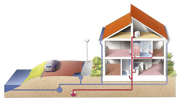 Từ hình trên, có thể thấy hai đường dẫn nước riêng biệt: màu đỏ là ống dẫn nước thải, còn màu xanh đậm là đường ống dẫn nước mưa. Ở Hà Lan, để tránh gây ô nhiễm môi trường, việc rửa xe ở nhà bị cấm vì nước chảy ngấm vào đất hay đường ống dẫn nước mưa.
