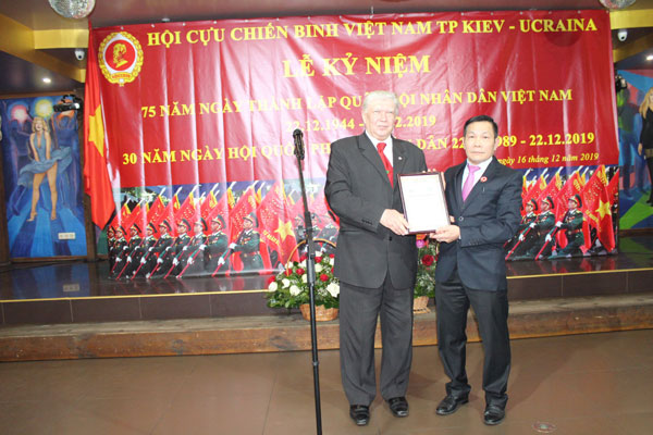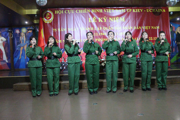 Phát biểu khai mạc buổi lễ, ông Đinh Văn Minh – Chủ tịch Hội Cựu chiến binh thành phố Kiev đã điểm lại 75 năm xây dựng, chiến đấu và trưởng thành của Quân đội Nhân dân Việt Nam, 30 năm ngày Hội Quốc phòng Toàn dân và ôn lại những kỷ niệm đẹp thời quân ngũ của toàn thể các cựu chiến binh, thanh niên xung phong, công nhân quốc phòng. Nhân dịp này, Đại sứ quán Việt Nam và Cơ quan Tùy viên Quốc phòng tại Ucraina gửi lời chúc mừng tới toàn thể cựu chiến binh, thanh niên xung phong, công nhân quốc phòng đang sinh sống tại thành phố Kiev nói riêng và toàn Ucraina nói chung. Thiếu tướng Vladimir Vaxilevich Popovich – Chủ tịch hội CCB Ucraina chúc mừng và trao tặng Kỷ niệm chương của Hội Cựu chiến binh Ucraina cho Hội Cựu chiến binh Việt Nam tại Kiev.