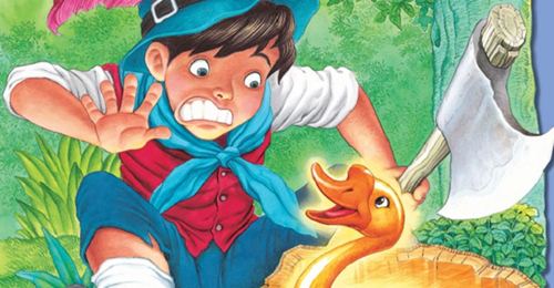 Chàng Ngốc đi đẵn cây. Hạ cây xuống thì thấy trong đám rễ có một con ngỗng lông bằng vàng thật. Anh nhấc ngỗng lên ẵm vào một quán trọ để ngủ đêm. Chủ quán có ba con gái. Ba cô thấy ngỗng, tò mò không biết là chim gì mà lạ thế, chỉ muốn lấy một chiếc lông của nó. Cô cả nghĩ cách nhổ trộm một chiếc. Khi chàng Ngốc vừa ra, chị nắm ngay lấy cánh ngỗng. Nhưng tay bị dính chặt vào đó, không rút ra được. Một lát sau, cô thứ hai đến cũng chỉ chăm chăm muốn lấy một chiếc lông vàng. Cô vừa đụng đến cô chị thì bị dính ngay vào chị. Cô thứ ba cũng tới cũng định tâm lấy lông. Hai cô chị kêu lên: