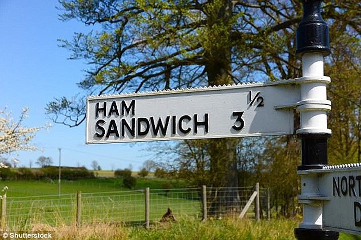 Ham (giăm bông) là một ngôi làng nhỏ thuộc thị trấn Sandwich (bánh mì kẹp) ở Kent, Anh. Biển báo ở đây ghi cả tên làng và thị trấn nên rất dễ đọc nhầm thành "Bánh mì kẹp sandwich". |