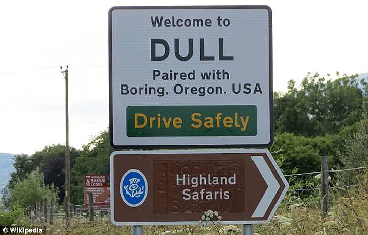 Thị trấn với tên gọi "Dull", có nghĩa là nhàm chán nằm ở Perthshire, Scotland, kết nghĩa với thị trấn Boring (buồn chán). Việc kết nối hai thị trấn này tạo nhằm mục đích thu hút khách du lịch chú ý và ghé thăm. |