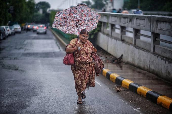 Một người phụ nữ đang chạy giữa cơn mưa để kịp bắt xe buýt. Ở một nơi đông đúc và thường xuyên ùn tắc giao thông như ở Delhi, người dân luôn phải chen chúc trên những chiếc xe buýt chật chội hàng ngày. |