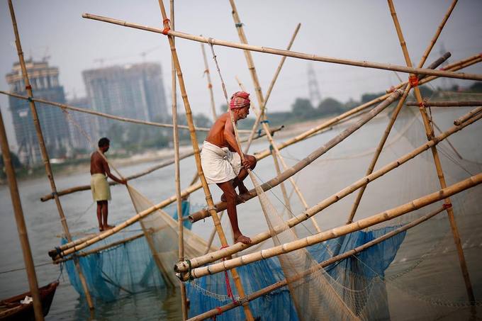 Một ngư dân đặt vó đánh cá trên bờ sông Yamuna ở Delhi. Đây là một trong những con sông ô nhiễm nặng nề nhất tại Ấn Độ do rác thải sinh hoạt và công nghiệp, theo Guardian. Tuy nhiên, người dân vẫn mưu sinh, lấy nước dùng cho gia đình và thực hiện nhiều nghi thức tâm linh ven con sông này. |