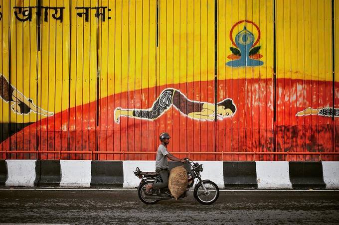 Người đàn ông này đang chở hàng hóa cồng kềnh đến nỗi không còn chỗ để chân trên chiếc xe máy nhỏ qua con đường vẽ graffiti màu sắc. Ấn Độ là thị trường xe máy hàng đầu thế giới, loại phương tiện này rất được ưa chuộng để di chuyển và chở đồ ở nơi đây. |