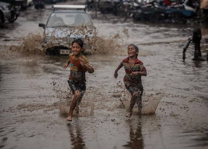 Những đứa trẻ chơi đùa trên đường phố ngập bùn lầy sau cơn mưa lớn. |