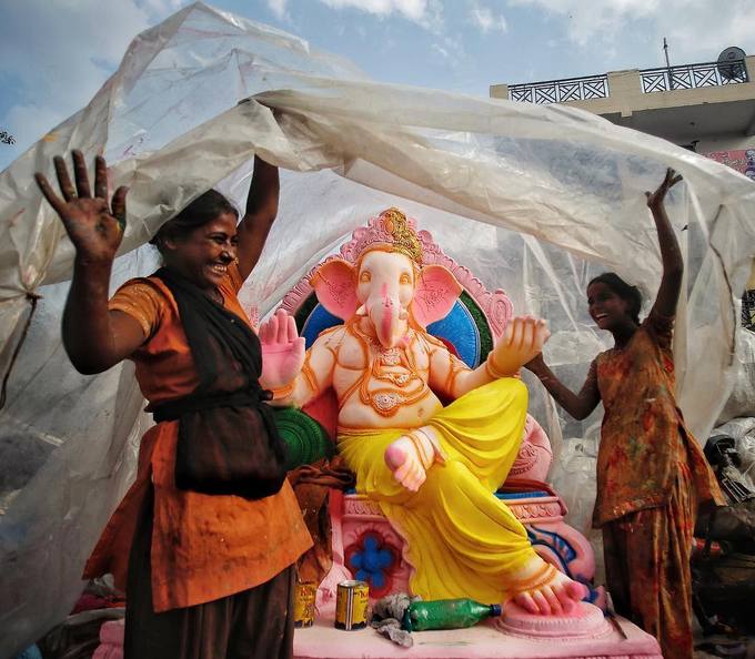 Để chuẩn bị cho lễ hội Hindu Ganesh Chaturthi giữa tháng 9, những người phụ nữ Ấn bọc lại bức tượng của thần đầu voi Ganesha, vị thần của sự thịnh vượng và trí tuệ. |