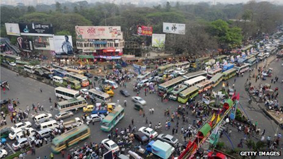 Dhaka được mệnh danh là thành phố ô nhiễm chật chội nhất thế giới. Thành phố này thiếu một hệ thống giao thông công cộng và một xa lộ chính để đáp ứng nhu cầu đi lại của 15 triệu người đang sống và làm việc tại đây. Có lẽ phải mất từ 2-3 tiếng đồng hồ để di chuyển được 15km bằng xe túc túc vào giờ cao điểm. Ngoài tắc đường, bạn còn phải chịu đựng thêm bụi bặm, khói xe, nóng nực và tiếng ồn. Luật giao thông ở Dhaka chưa được thực thi nghiêm túc và các phương tiện giao thông vẫn di chuyển theo cảm hứng.