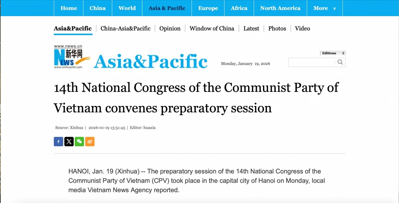 Đại hội Đảng XIV: Truyền thông quốc tế đưa tin đậm nét về ngày làm việc đầu tiên