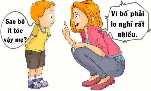 - Vấn đề này phức tạp lắm, sau này trưởng thành con sẽ hiểu. Người lớn phải gánh nhiều trách nhiệm, bố con phải lo nghĩ quá nhiều cho gia đình và công việc nên tóc rụng cả rồi. - Mẹ Tý mỉm cười, hài lòng với câu trả lời của mình về chứng hói của chồng.